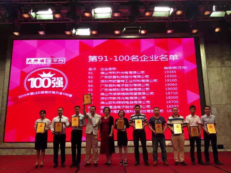 2016年6月7日,由大照明平臺(tái)主辦,佛山國家高新技術(shù)產(chǎn)業(yè)開發(fā)區(qū),佛山市南海區(qū)電光源燈飾照明行業(yè)協(xié)會(huì)聯(lián)合聚辦,e燈快線特別協(xié)辦“2015年LED照明燈飾行業(yè)100強(qiáng)”排行榜發(fā)布會(huì)在廣東省佛山南海獅山鎮(zhèn)羅村富林朗悅酒店隆重舉行,歐普特榮獲“2015中國LED照明燈飾行業(yè)百強(qiáng)榜“第93名