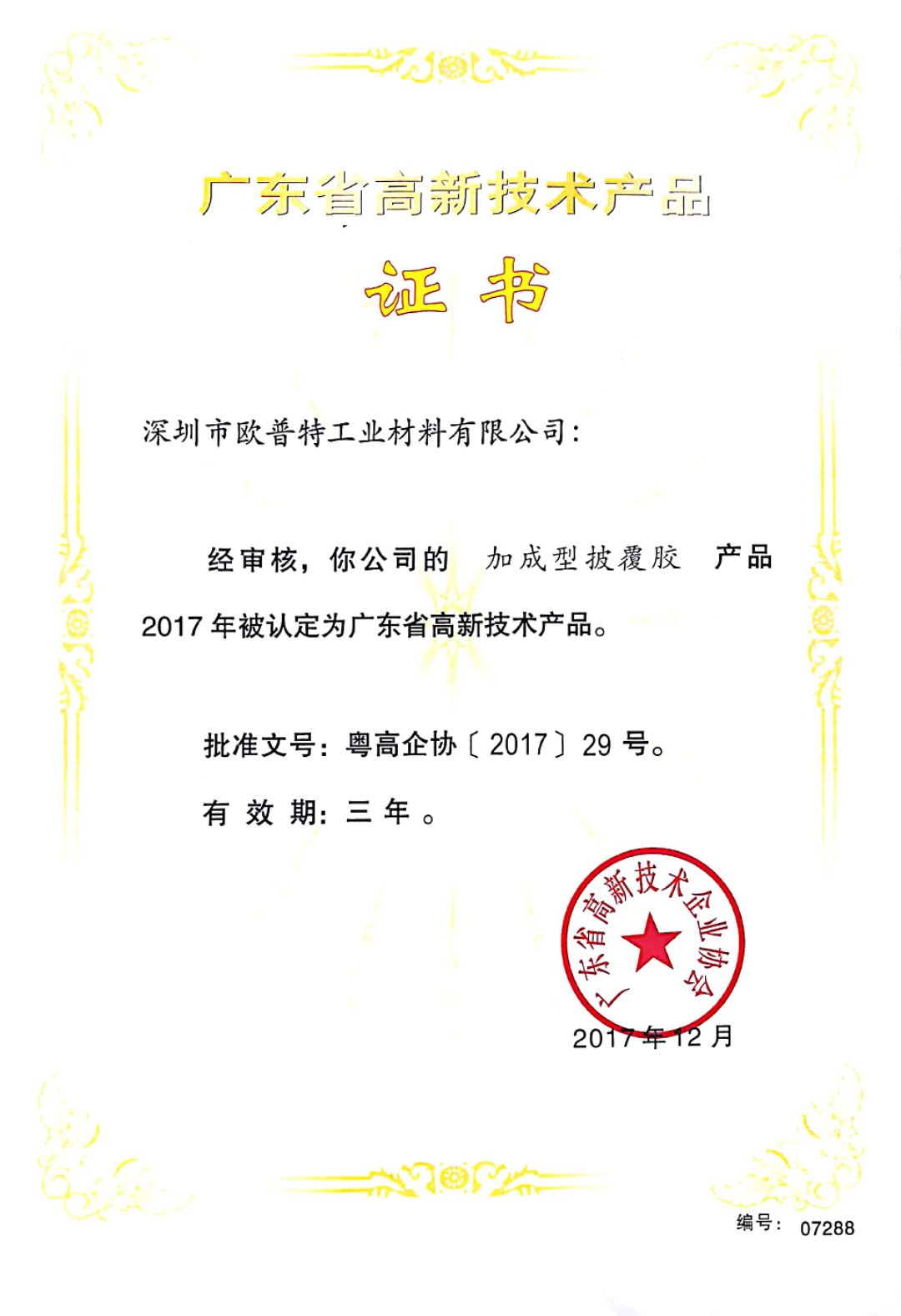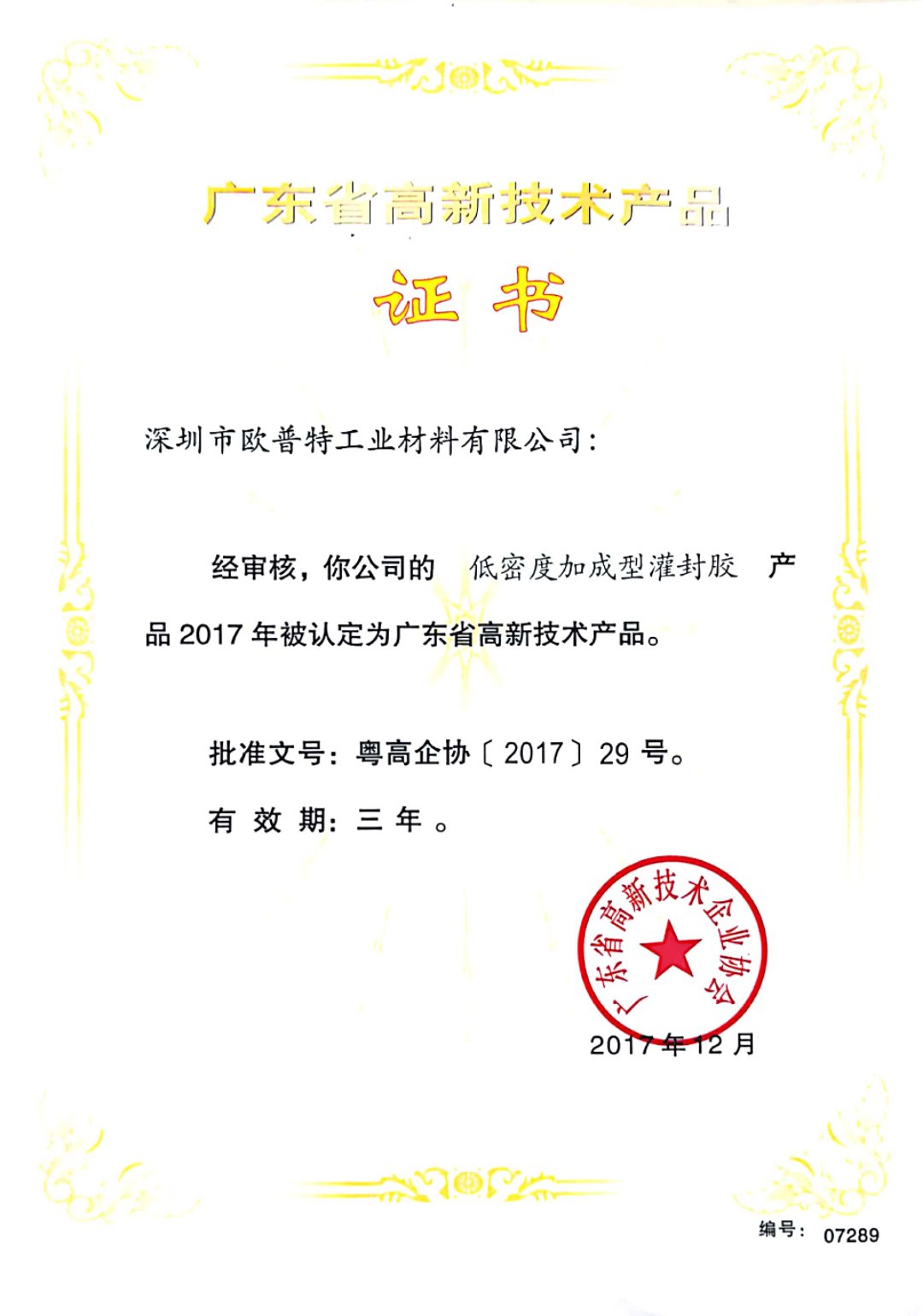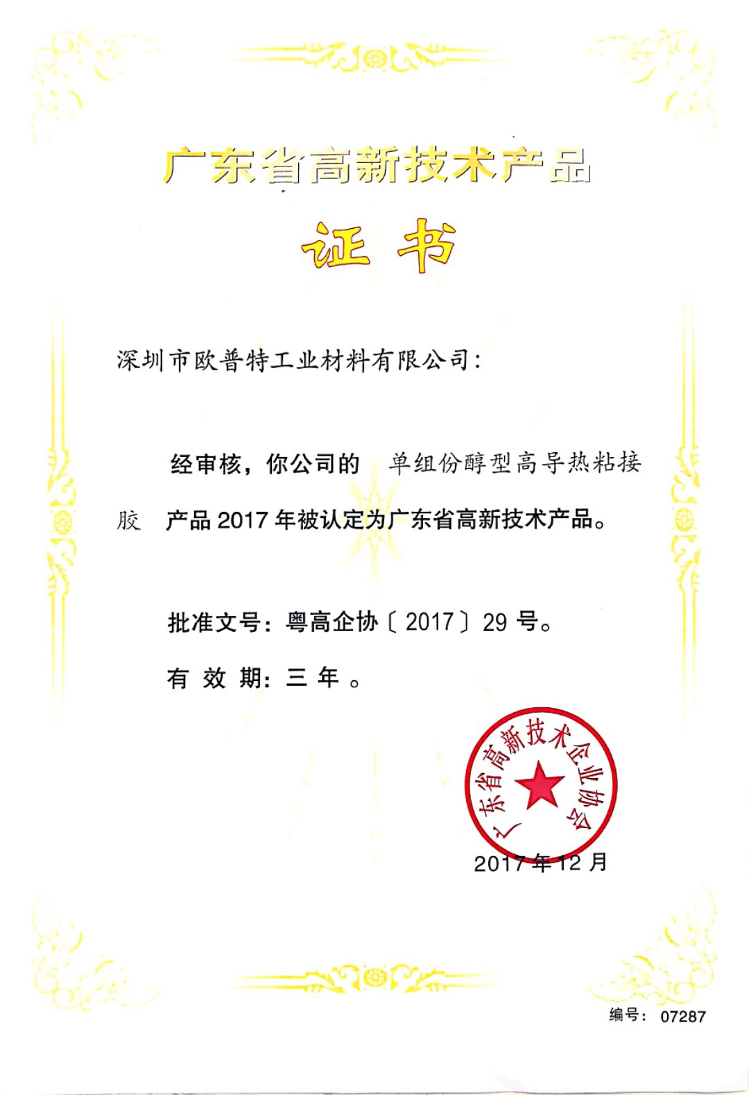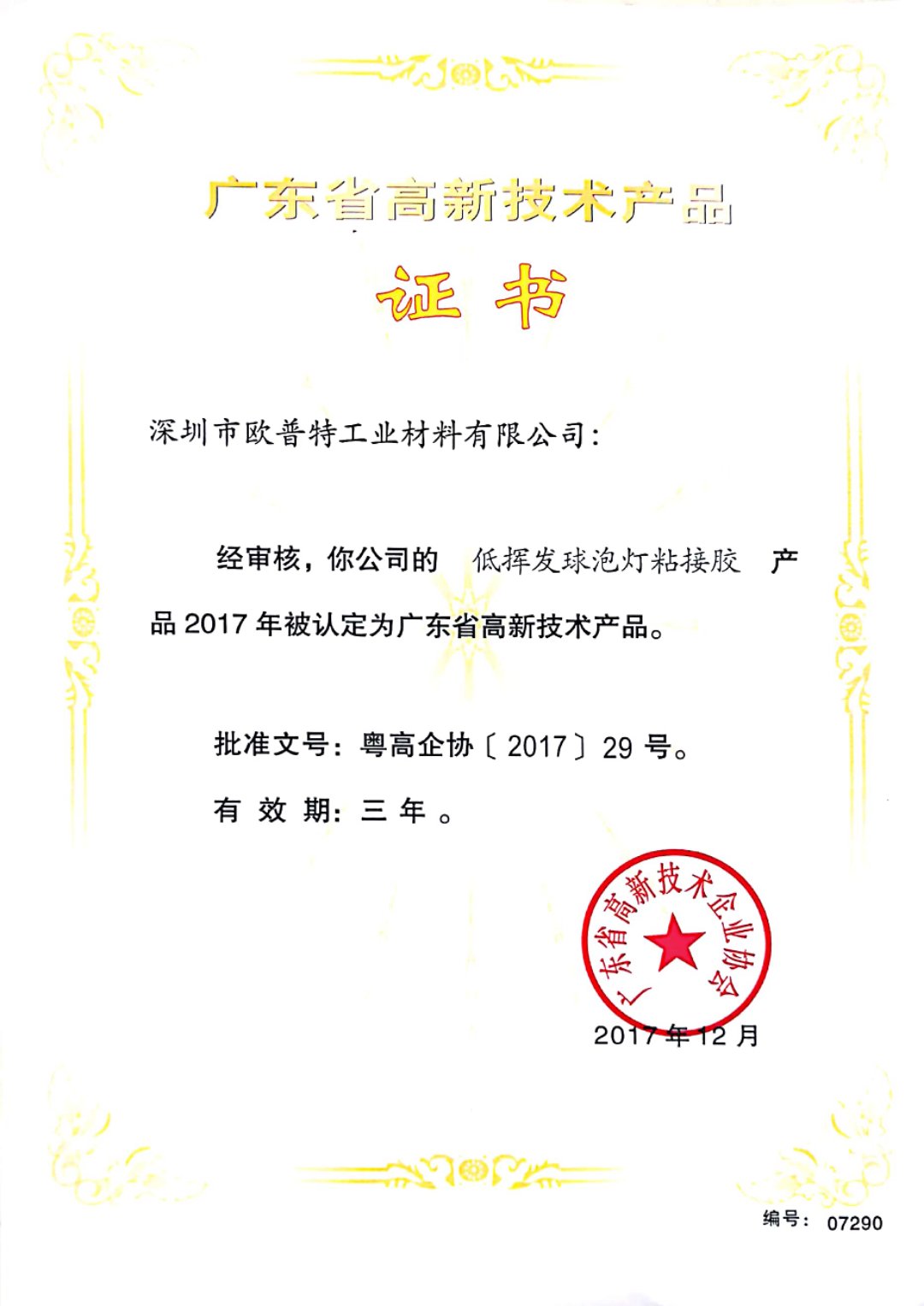 深圳市歐普特工業(yè)材料有限公司于2017年10月申請的6項廣東省高新技術(shù)產(chǎn)品經(jīng)過專家評審,于2017年12月通過廣東省高新技術(shù)企業(yè)協(xié)會認定,并于2018年5月領(lǐng)取了證書。