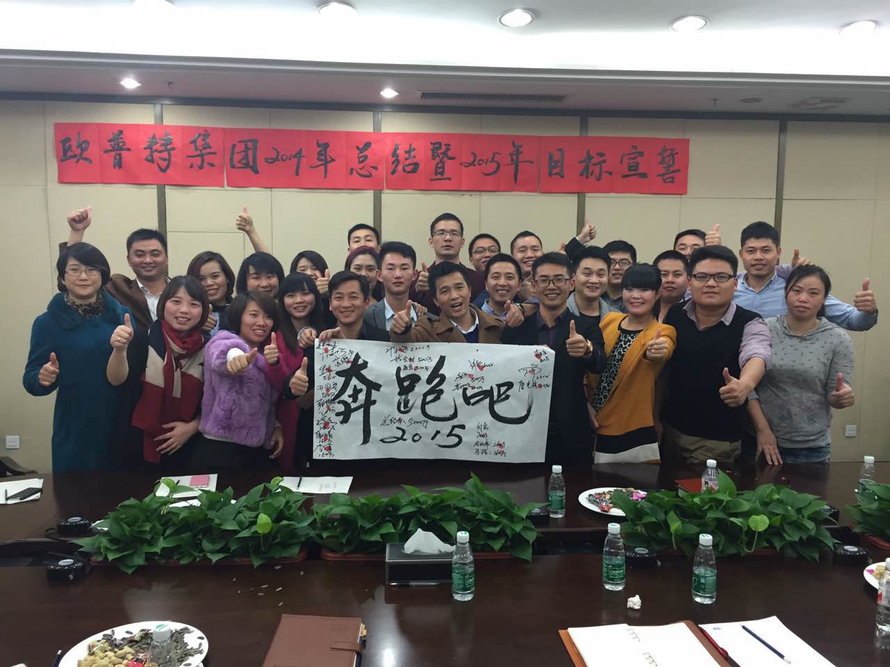 激動人心的目標宣誓環(huán)節(jié)終于來了,在激昂雄壯的音樂下,首先由光電一部鄭經(jīng)理簽字畫押了1200萬的個人業(yè)績承諾,然后每一個同事都簽下了自己的目標,并按上了一個個鮮紅的手指印,宣讀自己豪邁的承諾-----有承諾未完成目標裸奔的,也有承諾完成任務后請大家寶利來旋轉餐廳自助餐的。2015年大家都在努力逼自己改變,去實現(xiàn)自己更遠大的夢想。幾十個兄弟姐妹的夢想就像一條條娟娟溪流匯成大海,凝聚成歐普特集團2015年營銷戰(zhàn)略,由蘇立輝揮毫潑墨取名“奔跑吧2015”。
